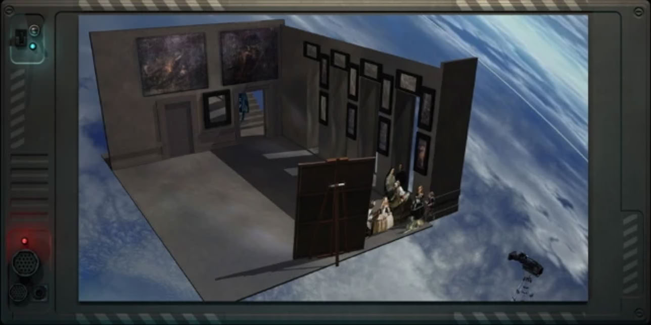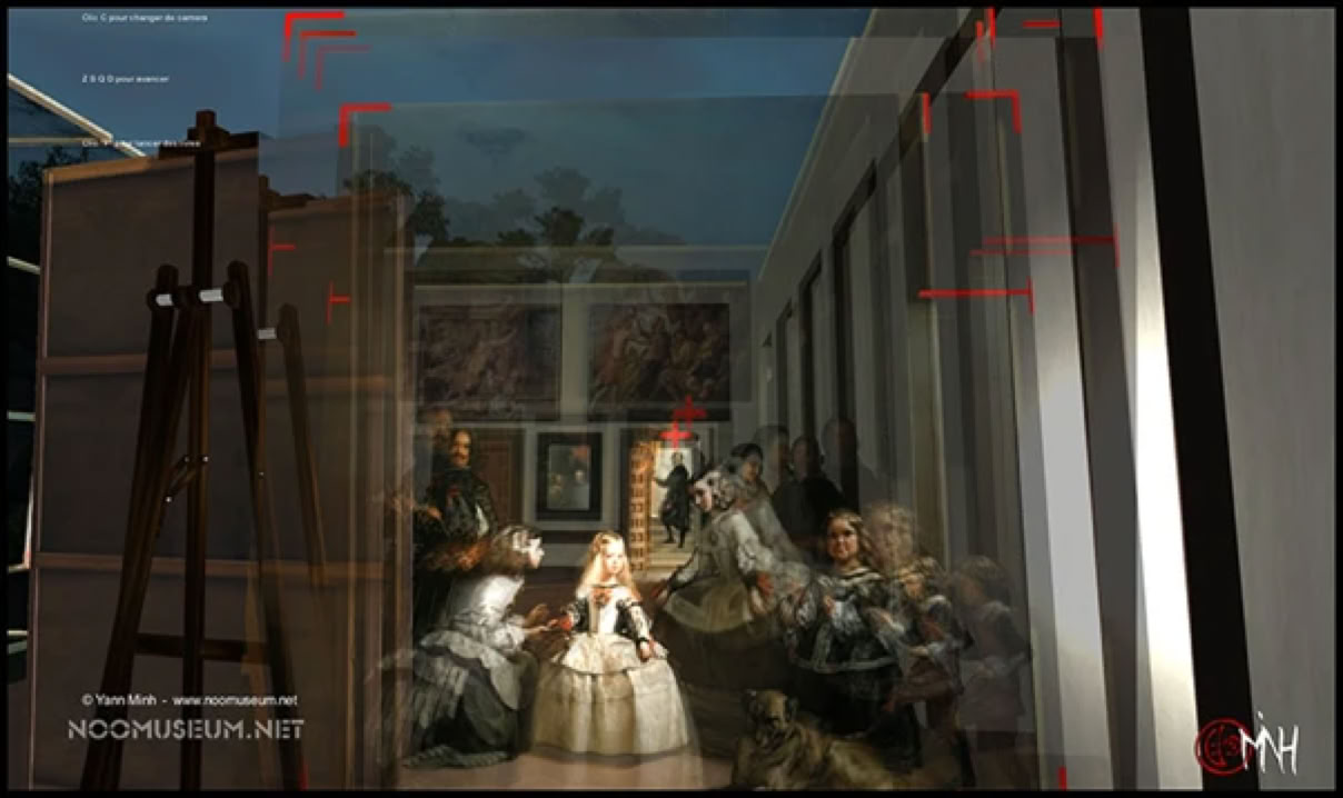 La NøøGalerie des Ménines de Velasquez est un exemple emblématique des galeries du Noomuseum, la recomposition en 3D temps réel du tableau permet d'explorer les mystères cachés de l'oeuvre, et en particulier, l'étrange porte cachée que j'ai découverte au fond du tableau.